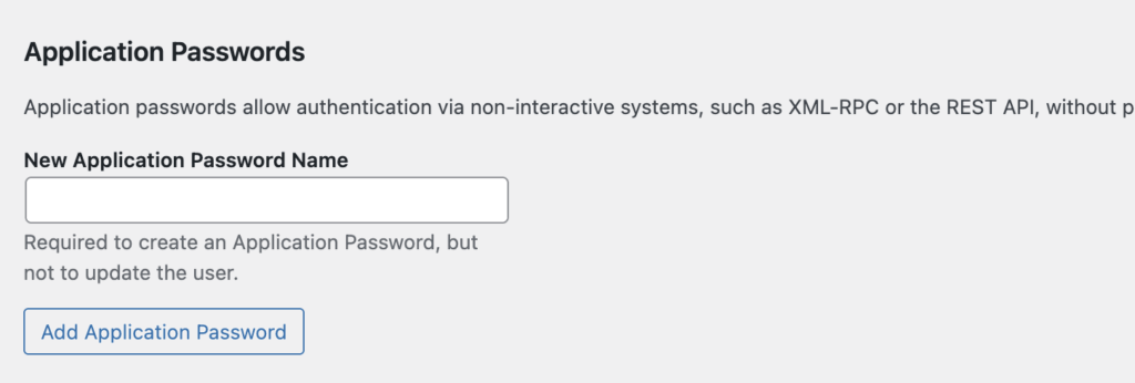 Scroll to the bottom, and locate this part of the profile form. The only thing you need to do now is to fill in a name (This can be whatever your want), and click “Add Application Password”.