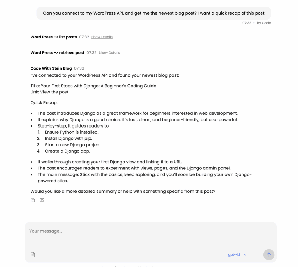 Okay, so at the top here, you can see my prompt. I simply just ask it to connect to the API, and get me the newest post and give me a quick recap of it. Okay, so now I know what my latest article was about. Awesome.