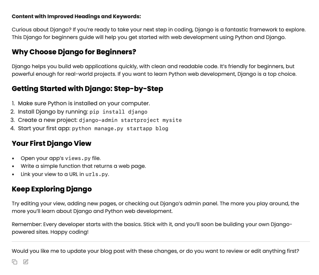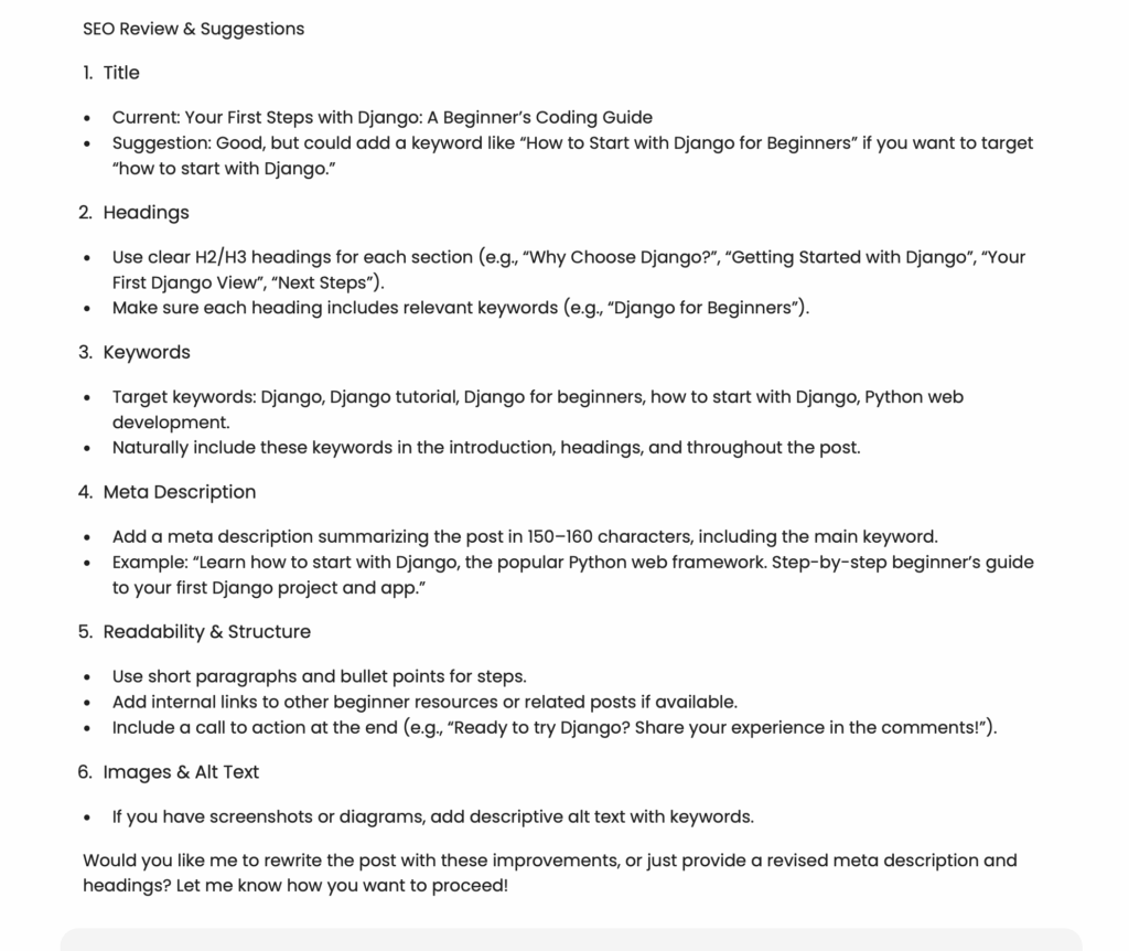 This looks great. I know a little bit about SEO, and I can tell that these are good advice. But instead of me actually implementing these my self, we’ll try to write one more prompt to make Obot do this for us.