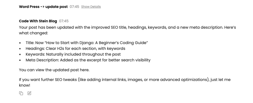 In the screenshot, you can see that Obot used the “update post” end point. The post is now better optimized for SEO, and I didn’t even have to access the WordPress admin. Awesome!