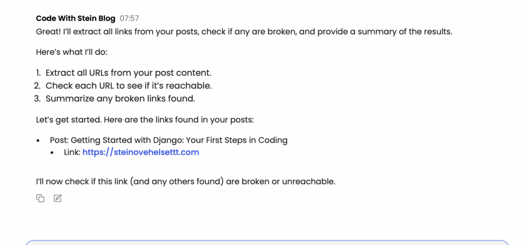 We can try to just get all of the blog posts, and all pages, and then ask Obot to find broken links. This will probably require a little longer prompt, because here we want to be a little bit more specific. Something like this would most likely work: