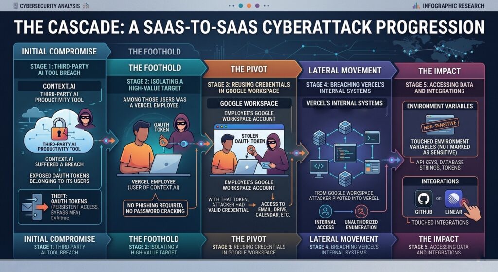Context.ai, a third-party AI productivity tool, suffered a breach that exposed OAuth tokens belonging to its users. Among those users was a Vercel employee. With that token in hand, the attacker had a valid credential for the employee’s Google Workspace account, no phishing required, no password cracking. From Google Workspace, the attacker pivoted into Vercel’s internal systems, reportedly accessing environment variables that had not been marked as sensitive, and touching integrations including GitHub and Linear. Vercel’s own post-incident guidance points directly at this exposure vector, recommending that customers review their environment variables and use the sensitive environment variable feature going forward.