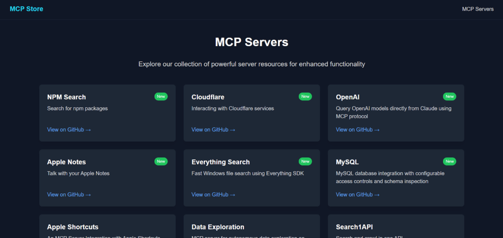 The MCP Store offers a growing collection of ready-to-use MCP servers designed to extend AI agents with access to services, data sources, and automation tools.